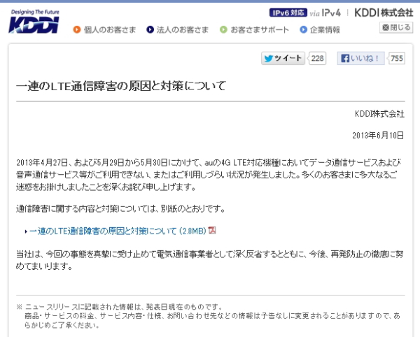 KDDI株式会社は10日、auの「4G LTE」対応端末において、4月と5月に高速データ通信サービス「LTE」の通信障害が発生した問題について、発表を行った。