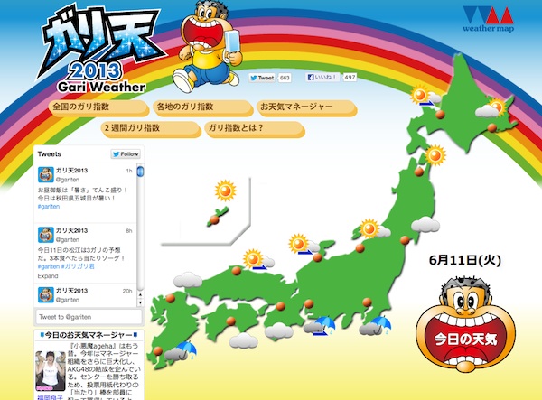 株式会社ウェザーマップおよび赤城乳業株式会社は、今年で8年目となる夏季限定のガリガリ君のお天気サイト「ガリ天2013」をリリースした。