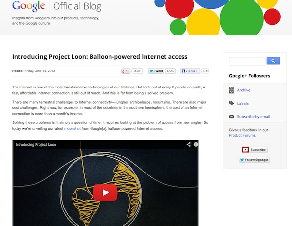 米Googleは、世界中の誰もがインターネットに接続できる環境の実現をねらい、気球でインターネット網を構築するプロジェクト「Project Loon」を発表した。