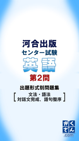 同アプリは、株式会社河合出版発行「センター試験 英語 出題形式別問題集2 英語 第2問[文法・語法、対話文完成、語句整序]」を元に作成したもの。A文法・語法問題、B対話文完成問題、C語句整序問題の3つの形式から構成され、10回分の演習問題となっている。また、丁寧でわかりやすい解説とともに選択回答形式で収録しているため、効率よく学習することが可能だ。