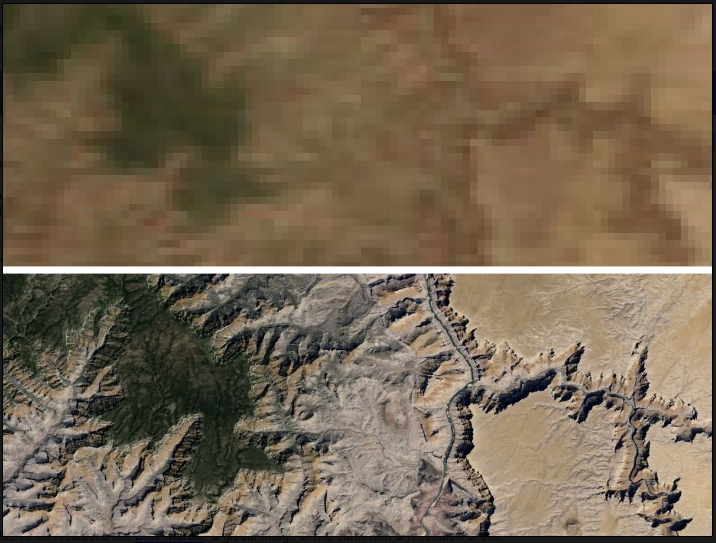 今回の刷新は、アメリカ地質調査所(USGS)とアメリカ航空宇宙局(NASA)の衛星「ランドサット7」が撮影した画像データを、Google Earthエンジンを使用して合成したもの。撮影データの量は数百TBにのぼり、その結果1ピクセルあたり15mの高解像度で鮮明な衛星写真が見られるようになった。