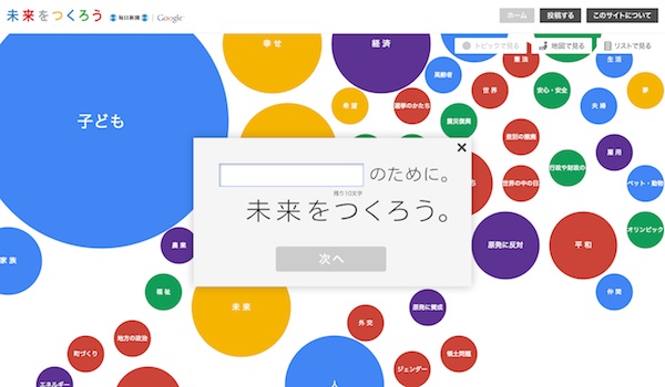 Googleと毎日新聞社は、第23回参議院選挙に向け、選挙や投票に対して自分の想いを投稿したり、みんなの想いを知ることができる「未来をつくろう 参院選 2013」をオープンした。