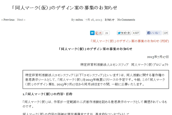特定非営利活動法人コモンスフィアは17日、作家の作品を第3者が二次創作することを認める意思表示ツール「同人マーク(仮)」について、デザイン案を一般公募すると発表した。応募期限は7月28日。