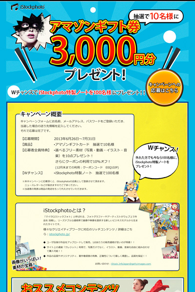 このほか、ゲッティ イメージズの姉妹サイトである「iStockphoto」では、抽選で10名に3000円分のアマゾンギフトカードが贈られるキャンペーンを現在開催中。素材10点がプレゼントされる応募者全員特典や、特製ノートが抽選で100名に当たるWチャンスも用意されている。期間は2013年7月31日(水)まで。