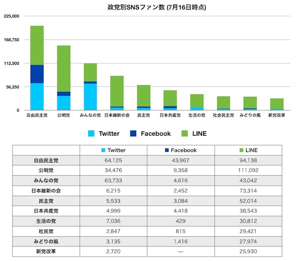 LINE「友だち」最多は公明党、Twitterのフォロワー最多はみんなの党——参議院選挙
