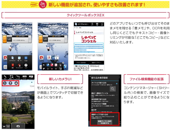 「AQUOS PHONE ZETA SH-09D」でも新機能が追加される。「クイックツールボックスEX」では、「10D」にも追加された「書メモ」やOCRを利用してどこでもテキストコピー・画像トリミングが可能な「どこでもコピー」などに対応する。