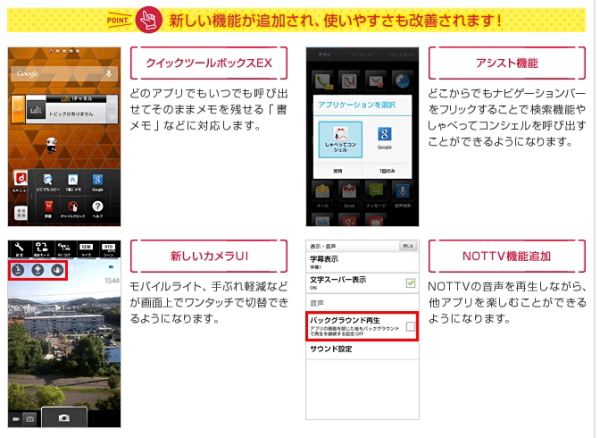 「AQUOS PHONE sv SH-10D」のOSバージョンアップでは、いくつかの新機能が追加される。「クイックツールボックスEX」では、アプリをいつでも呼び出せてメモを残せる「書メモ」に対応。「アシスト機能」では、ナビゲーションバーをフリックすることで、検索機能やしゃべってコンシェルを呼び出せるようになる。