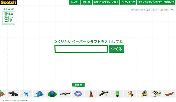 住友スリーエム株式会社は、メンディングテープやはさみ、カッターなどを展開する「スコッチ」ブランドにおいて、約300種類のペーパークラフト(紙工作)の展開図がダウンロードできるWebサイト「スコッチ 毎日つくろう!夏休みファミリー工作」を2013年8月31日(土)までの期間限定で提供するという。