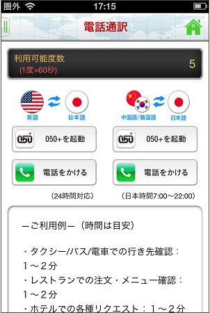 「電話通訳」は、24時間対応が英語通訳、7時~22時(日本時間)対応が中国語・韓国語通訳となっている。「音声通訳」は、話した言葉を自動で翻訳できる。対応言語は、日本語、英語、簡体中国語、繁体中国語、韓国語、ドイツ語、スペイン語、フランス語、イタリア語、アラビア語、チェコ語、デンマーク語、ギリシア語、フィンランド語、ハンガリー語、インドネシア語、オランダ語、ノルウェー語、ポーランド語、ポルトガル語、ルーマニア語、スロバキア語、スウェーデン語、トルコ語、ベトナム語の25言語。