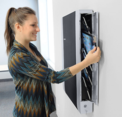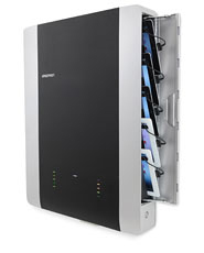 同製品は、10台のiPadの充電と管理をコンパクトなスペースで行えるウォールマウント。USBハブの機能を内蔵しており、マスターPCをUSBで接続すると同期モードになり、接続されているすべてのiPadとデータ通信を行える。通気ファン付きで廃熱対策も施されており、扉を開けると収納ラックが手前まで引き出される「Show&Stow」機能を搭載する。