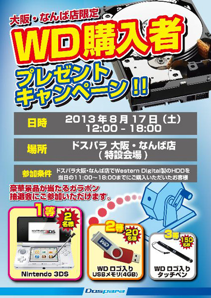 株式会社ドスパラは、ドスパラ 大阪・なんば店(大阪府大阪市)の特設会場にて「WD購入者プレゼントキャンペーン!!」を8月17日に実施することを発表した。開催時間は12:00〜18:00。当日の11:00〜18:00にWestern Digital製のHDDを購入したユーザーを対象とするキャンペーンとなっている。