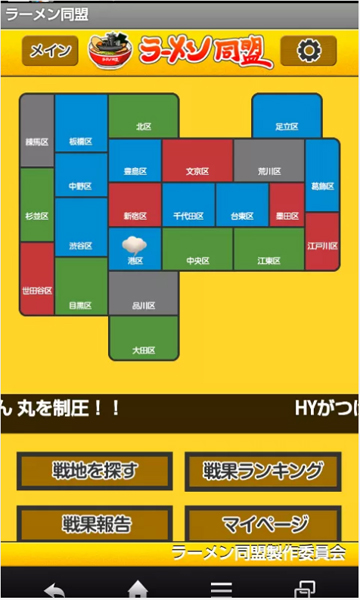 さらに、Androidアプリではゲーム性を取り入れた店舗情報の投稿機能を搭載する。「こってり」「がっつり」「あっさり」の3種類のラーメンタイプ別同盟軍から所属する軍を選択可能で、ユーザーは自身が所属するタイプのラーメンに関するレビューを投稿することで軍の勢力を拡大できる。各区で今どのタイプのラーメンが人気なのかをゲーム感覚で検索することも可能だ。
