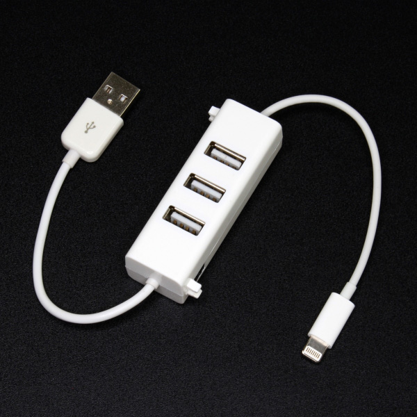 本製品では、ケーブルの途中にUSBハブが用意されている。USB 2.0/1.1に対応し、Windows 8/7/VistaおよびMac OS X v10.3以降に対応。ハブ本体のサイズは18(幅)×65(高さ)×18(奥行き)mmで、重量は約110gとなっている。なお、LightningケーブルはApple純正品ではなく互換品で、同社ではiOS 6.1.4までの動作確認済み。