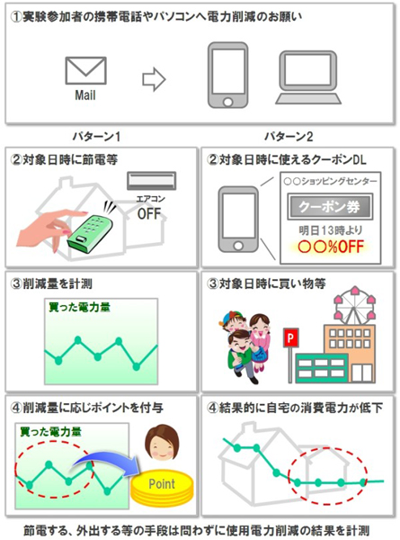 デマンドレスポンスとは、家庭内での節電で生じる電力に対して発電事業者が経済的なインセンティブなどを提供することで、一般家庭での節電を促進する仕組みのこと。同実証実験では、スマートフォンやPCから家庭内の消費電力量や発電量を確認できるモニタリングサービスを利用して電力の利用状況を可視化するほか、居住地域や年齢層などの情報をユーザーに登録してもらうことにより、近隣の商業施設で利用できるクーポンやポイントを、お買い得情報や節電を呼びかけるメッセージと合わせてスマートフォンやPCに送付する。