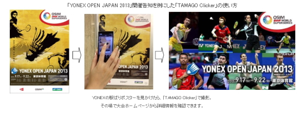 本サービスの第1弾は、東急東横線・田園都市線渋谷駅でバドミントンの国際大会「YONEX OPEN JAPAN 2013」の、開催告知の駅ばりポスターで利用できる。「TAMAGO Clicker」アプリを起動してカメラで撮影すれば、同大会のホームページから大会情報などを確認できる。