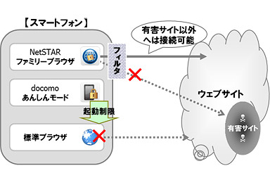 株式会社エヌ・ティ・ティ・ドコモ(NTTドコモ)は、スマートフォン向けフィルタリングサービス「あんしんモード」を拡充し、ネットスター株式会社が提供する「ファミリーブラウザ for docomo」と連携させる機能を2013年8月28日から提供開始すると発表した。同ブラウザは「あんしんモード」をdメニューまたはGoogle Playからダウンロードして利用する。利用料は無料。