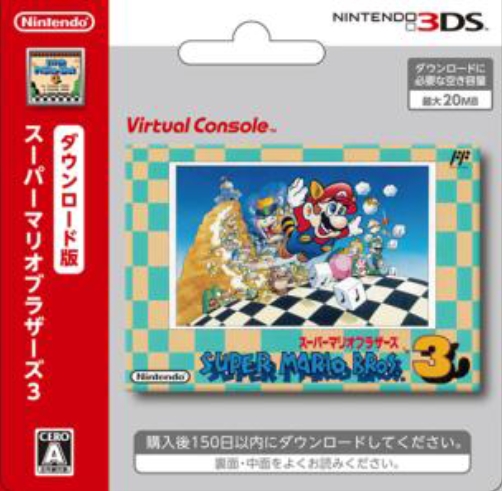 ニンテンドー3DS バーチャルコンソール「スーパーマリオブラザーズ3」ダウンロードカードは、1988年発売の「スーパーマリオブラザーズ3」のバーチャルコンソールのソフトがダウンロードできる。価格は500円。