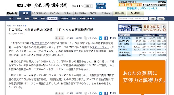 日本経済新聞は、11日の株式市場でNTTドコモの株価が4年8カ月ぶりの高水準となったと伝えている。iPhoneの新機種をNTTドコモも発売すると同日発表したことを受け、顧客流出に歯止めがかかると期待しての「買い」だったとしている。