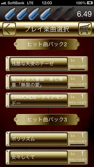 アプリにはあらかじめ3曲が収録されており、より多くの楽曲を楽しみたい場合は追加楽曲パック(1パック300円)を購入できる。