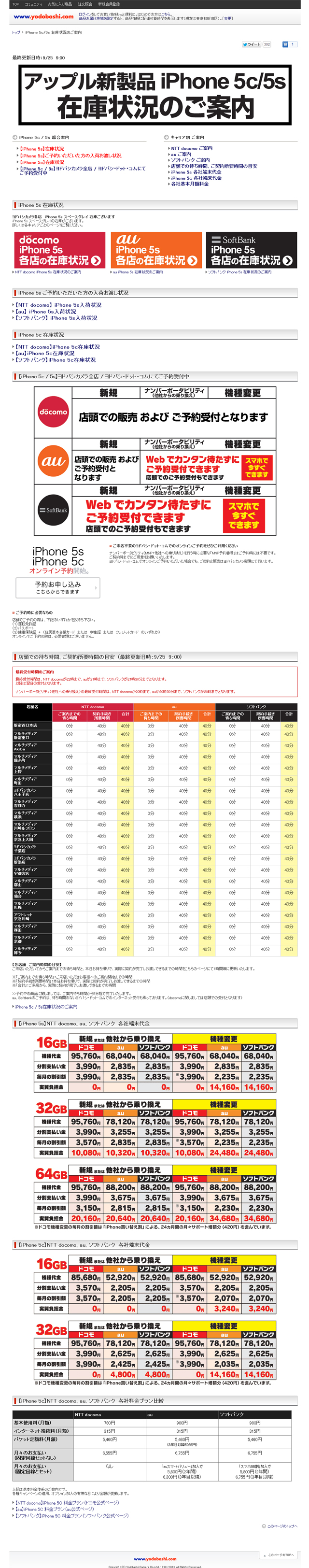 ちなみに今回もヨドバシカメラでは、アップルの新iPhoneの予約受付を開始しており、ドコモ版/ソフトバンク版/au版iPhone5s/5cの在庫状況および店頭での待ち時間、契約所要時間の目安をWeb上で公表しています。各社の端末代金から料金プラン比較まで用意されていますので、チェックしてみるのも良いでしょう。