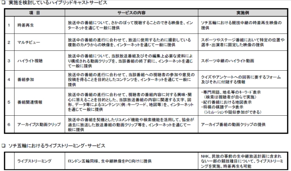 2014年2月7日~2月23日にかけて、ロシアのソチで開催される冬季オリンピックに関しての申請は、「時差再生」「ライブストリーミング」の2つ。「時差再生」はハイブリッドキャストサービスの一つで、放送中の番組をさかのぼって視聴できる映像をネットで提供するもの。「ライブストリーミング」はパソコン向けの生中継で、NHKや民法で放送されない一部競技や時差再生も可能。