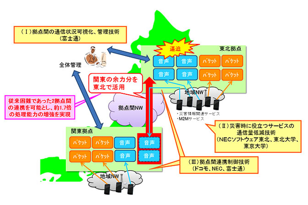 株式会社NTTドコモと日本電気株式会社(NEC)、富士通株式会社、NECソフトウェア東北株式会社、国立大学法人東北大学電気通信研究機構(東北大学)、国立大学法人東京大学先端科学技術研究センター(東京大学)は、大規模災害などによって通信混雑が発生した際に、離れた地域の通信設備を活用することで効率的に通信混雑を緩和する技術を確立し、東北大学構内(仙台市)と横須賀リサーチパーク内(神奈川県横須賀市)にあるテスト環境での実証実験を開始した。