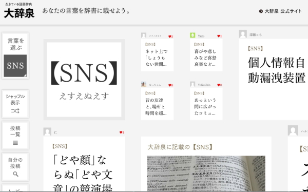 株式会社小学館の国語辞典「大辞泉」編集部は、デジタル大辞泉に載せる「愛」「自由」「大人」「失敗」「カワイイ」「友だち」「萌え」「SNS」の8つの言葉の語釈を一般募集すると発表した。優れた語釈はデジタル大辞泉の12月定期改定時に収録される。