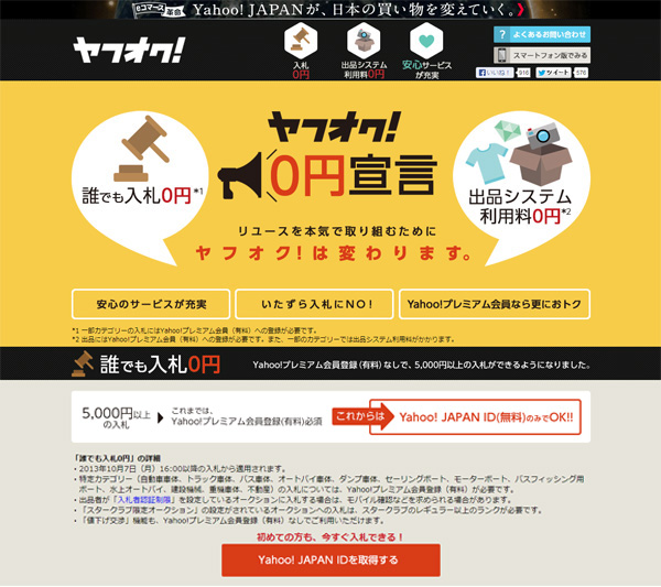 また、「ヤフオク!」では個人の出品システム利用料を原則無料化されるほか※1、これまで5000円以上の入札には「Yahoo!プレミアム会員」への登録が必須だった「ヤフオク!」への入札も無料化すると述べています。※2
