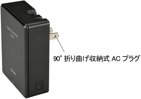 同製品はACプラグ一体型のモバイルバッテリー。ACプラグは90度に折り曲げて本体に収納することが可能で、持ち運ぶときにも邪魔にならない。また、内蔵リチウムイオン電池を同社独自の専用ケースに収納して分離搭載することで、電池に問題が生じた場合でも本体内部への影響が防げる。電池容量は2500mAhで、約500回の繰り返し充電が可能。