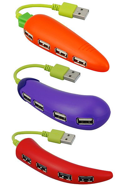 株式会社グリーンハウスは、USBハブの新製品として、にんじんの形の「GH-UH204CARR」、なすの形の「GH-UH204NASU」、とうがらしの形の「GH-UH204PEPP」を10月下旬に発売する。既に販売中のさやえんどう形/バナナ形のモデルに続く食べ物を模した筐体のユニークな製品。いずれも価格はオープンとなっている。