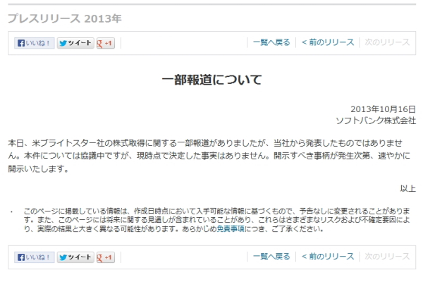 同発表によると、米ブライトスター社の株式取得に関しては、「本件については協議中ですが、現時点で決定した事実はありません。開示すべき事柄が発生次第、速やかに開示いたします。」とのこと。米ブライトスター社は、通信キャリアへのスマートフォン端末の卸売業で大手。ソフトバンクも取引先の一つだが、株式取得によって傘下に収めると見られる。
