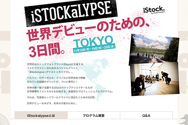 ゲッティ イメージズ ジャパン株式会社の傘下ブランド「iStock」による参加費無料のフォトグラファー向け実践型集中プログラム。東京開催は2010年以来の2回目で、3日間にわたりセミナー/レクチャーを受けながらの撮影会/クリエイティブ・ディレクターによる撮影写真のレビュー/プロ向け機材の無料体験などの各種プログラムが展開される。参加にはポートフォリオ/作品の審査が事前に必要で、応募締切は2013年11月1日(金)。