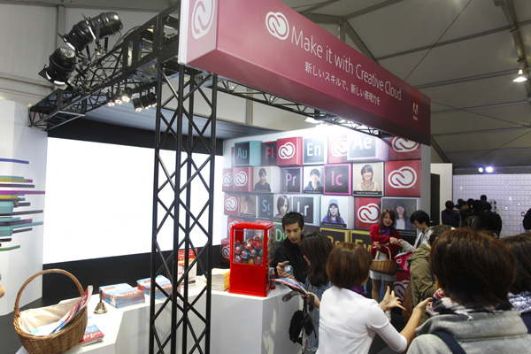 「Make it with Creative Cloud. 新しいスキルで新しい表現力を」のキャッチフレーズで、学生の目線に立ったキャンペーンを展開しているアドビブース。展示の目玉は、自分の身体の動作と連動して、スクリーン上にモーショングラフィックスが生成されるインスタレーション展示だ。