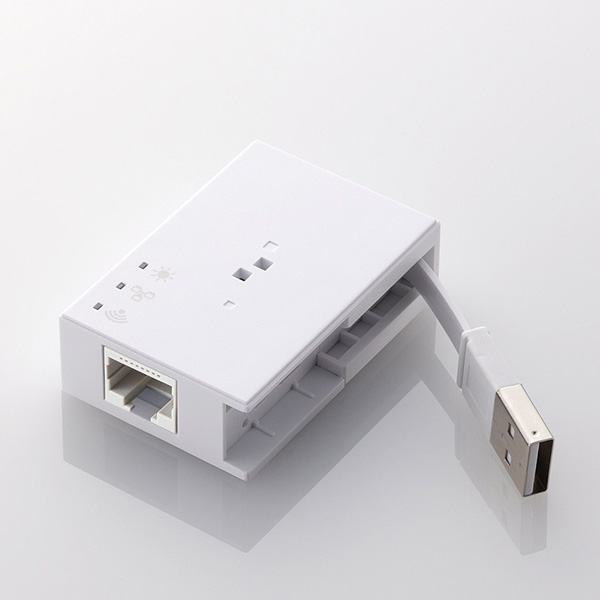 本製品では、本体サイズが約36(幅)×52(高さ)×16(奥行)mm、重量が約26gと、コンパクトな設計が実現されている。ホテルルータモードとアクセスポイントモードを搭載し、利用状況に応じて使い分けが可能。有線接続部は10/100BASE-TX仕様で、本体には設定用にWPS2.0ボタンを搭載し、暗号化機能としてWEP(64bit/128bit)、WPA-PSK(TKIP/AES)、WPA2-PSK(AES)、WPA/WPA2-Mixed(TKIP/AES)に対応している。電源はUSBバスパワー接続による供給で、USBケーブルはコネクタごと本体に収納することが可能。