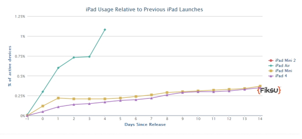 「Fiksu」は、アプリ開発者にアプリの利用状況を知らせるモバイルアプリマーケティングデータ提供会社。発表は、Fiksuの調査プログラムが入ったクライアントアプリを導入しているiPadからのデータをまとめて行われている。Fiksuが発表した、発売日からの全体に占める利用台数の変化グラフからは、発売から4日時点で「iPad Air」が「第4世代iPad」や「iPad mini」よりも約6.3倍売れていることが分かる。