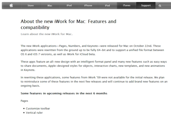 Appleは6日(米国時間)、10月22日にアップデートしたばかりのオフィススイート「iWork」に関して、新バージョンになって削除された旧バージョンの機能の一部について復活させると発表した。