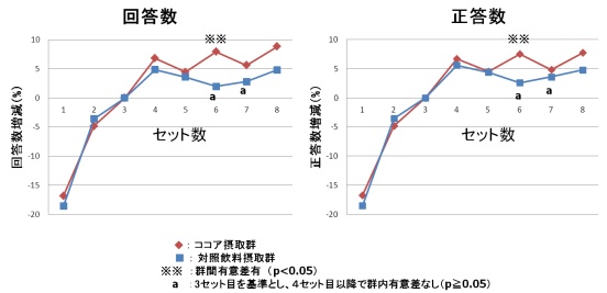 発表によると、ココアまたは対照飲料(キャラメル風味飲料)を摂取してから45分後に、ココアの摂取群は対照飲料摂取群と比較して、回答数および正答数ともに増加したことが明らかに。また、誤答率が低い被験者による統計処理を行ったところ、ココア摂取群と対照飲料摂取群の差はより顕著になったという。さらに、それぞれの試験飲料を摂取してから45分後と75分後に回答数および正答数に有意差が認められたとしている。