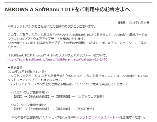 ソフトバンクモバイル株式会社は14日、富士通製のスマートフォン「ARROWS A 101F」のOSをAndroid 4.1にアップデートすると発表した。