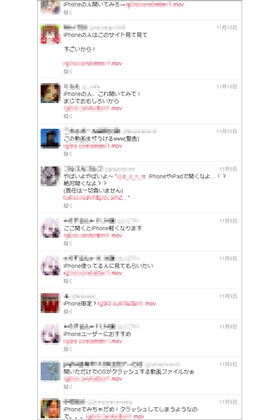 同ファイルは拡張子がMOVの動画ファイルとしてURLが拡散されており、このURLにiPhoneでアクセスするとエラーが発生して強制的に再起動される。iOS7では再起動前にブルースクリーン状態となることもある。同社の調べでは、日本でこのURLを含む最初のツイートは11月8日14時頃で、11月14日17時までの時点で196件の日本ユーザーによるツイートが確認できたという。