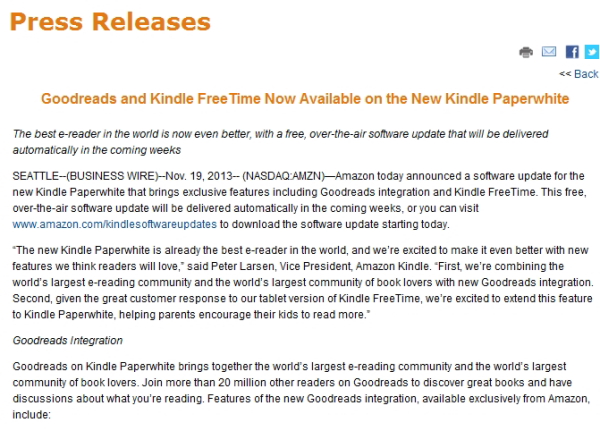 今回ソフトウェアがアップデートされたのは、第2世代の「Kindle Paperwhite」。「Goodreads」との統合によって、気に入った文章を共有したり、友人が読書中の本やレビューが閲覧できるようになった。ほかには、子どもに本を与えたり、読んでいる本について親がチェックできるペアレンタルコントロール「Kindle Freetime」や、書籍管理機能「Cloud Collections」が追加された。