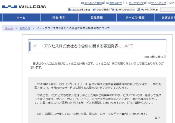 株式会社ウィルコムおよび株式会社ウィルコム沖縄は11日、12月3日に発表されたイー・アクセス株式会社との合併に関して、合併後もPHSサービスを継続すると発表した。