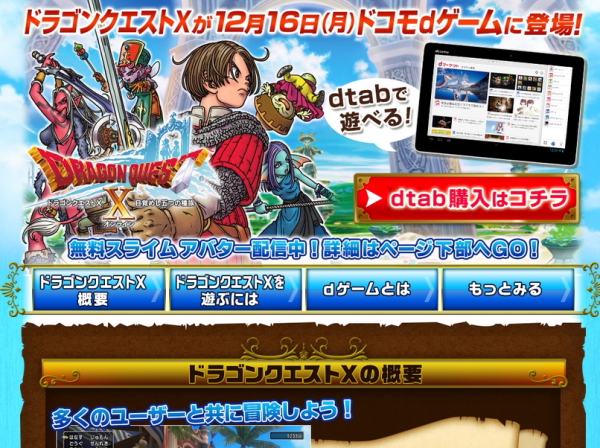 「dtab」は、10.1インチディスプレイ搭載で1万円を切る、9975円で販売されているタブレット。SPモード契約、docomo IDがあれば、ドコモ「dゲーム」に登場する「ドラゴンクエストⅩ」が、「dtab」を使ってプレイできるようになる。これにより、任天堂のWii/Wii U、MicrosoftのWindows搭載デバイスでプレイしているプレイヤーとも一緒に遊ぶことができるようになった。