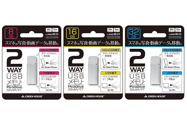 グリーンハウス、変換アダプタ不要でスマホ/PC両対応のUSBメモリを発売