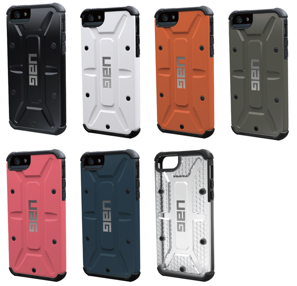 カラーはUAG-IPH5Sシリーズがクリア、ブルー、オレンジ、グレーグリーン、ホワイト、ブラック、ホットピンクの7色。UAG-IPH5Cシリーズがクリア、ブラック、ホワイトの3色。UAG-IPDA-BLKがブラックのみで、UAG-IPDMシリーズはブラックとホワイトの2色。