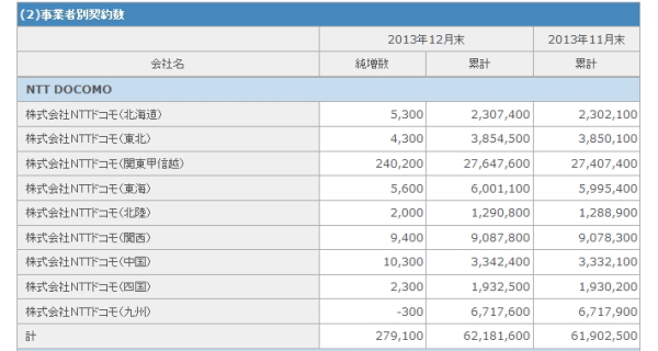 一般社団法人 電気通信事業者協会(TCA)は10日、2013年12月の事業者別の携帯電話契約数を発表した。純増数は主要3キャリアの全てがプラスだったが、23カ月連続トップだったソフトバンクモバイル株式会社に変わり、27万9100件を獲得した株式会社エヌ・ティ・ティ・ドコモ(docomo)が、2011年12月以来、2年振りとなるトップに立った。