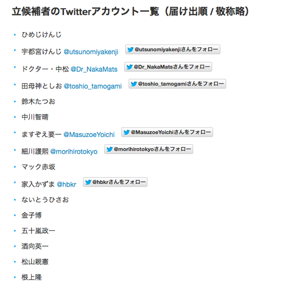 Twitterは、2014年東京都知事選挙の投開票日である2月9日(日)に向け、立候補者とTwitterアカウント一覧を公開した。