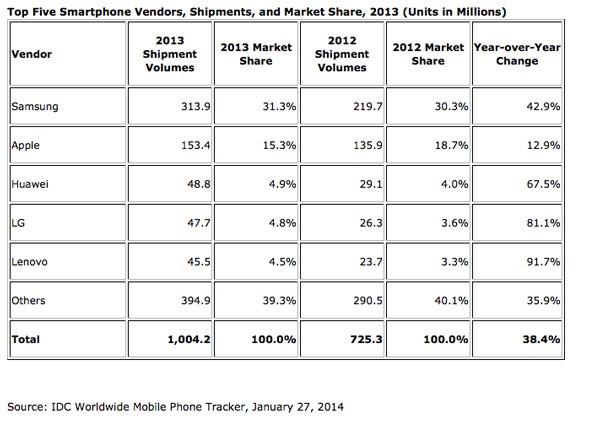 携帯電話の世界市場、2013年はスマホが初の10億台を突破——首位はSamsung