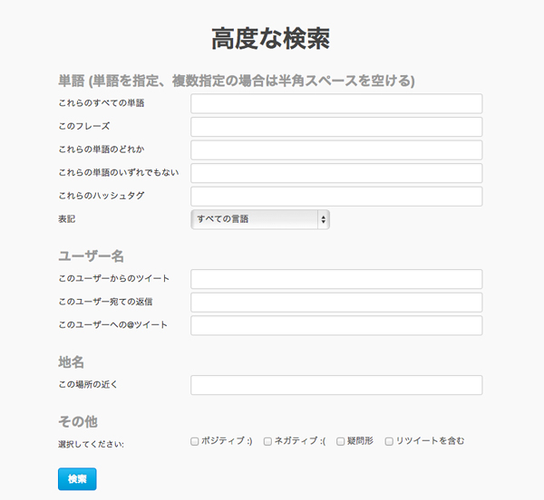 新しいフィルタは「動画」「ニュース」のほか「高度な検索」の3つ。「高度な検索」では単語の指定、特定のユーザーが投稿したツイートの単語検索・返信・@ツイート検索などが行えるほか、地名、ネガティブ、ポジティブ、疑問形の検索も行えるようになった。