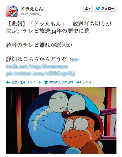 「ドラえもん打ち切り」「松本潤結婚」などデマ、Twitterでスパムアプリ認証に注意