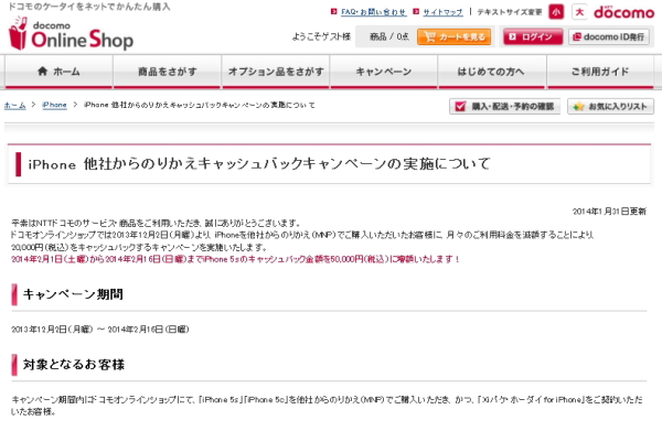 キャッシュバックキャンペーンは、2013年12月2日~2014年2月16日の期間に、「ドコモオンラインショップ」でiPhone 5s、iPhone 5cを他社からの乗り換えであるMNPで購入し、プランは「Xiパケ・ホーダイ for iPhone」を契約したユーザーが対象。2014年1月31日まではキャッシュバック金額が2万円だったのが、2月1日~2月16日までの対象ユーザーは3万円増額して5万円のキャッシュバックとなった。